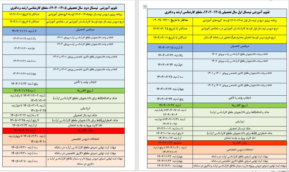 تقویم آموزشی کارشناسی ارشد و دکتری (1405-1404)