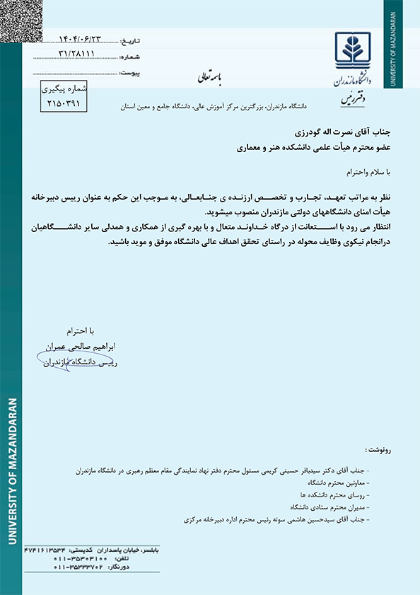 به گزارش روابط عمومی دانشگاه مازندران، دکتر ابراهیم صالحی عمران رییس دانشگاه، طی حکمی نصرتاله گودرزی عضو هیات علمی دانشکده هنر و معماری را بهعنوان رییس دبیرخانه هیات امنای دانشگاههای دولتی مازندران منصوب کرد.